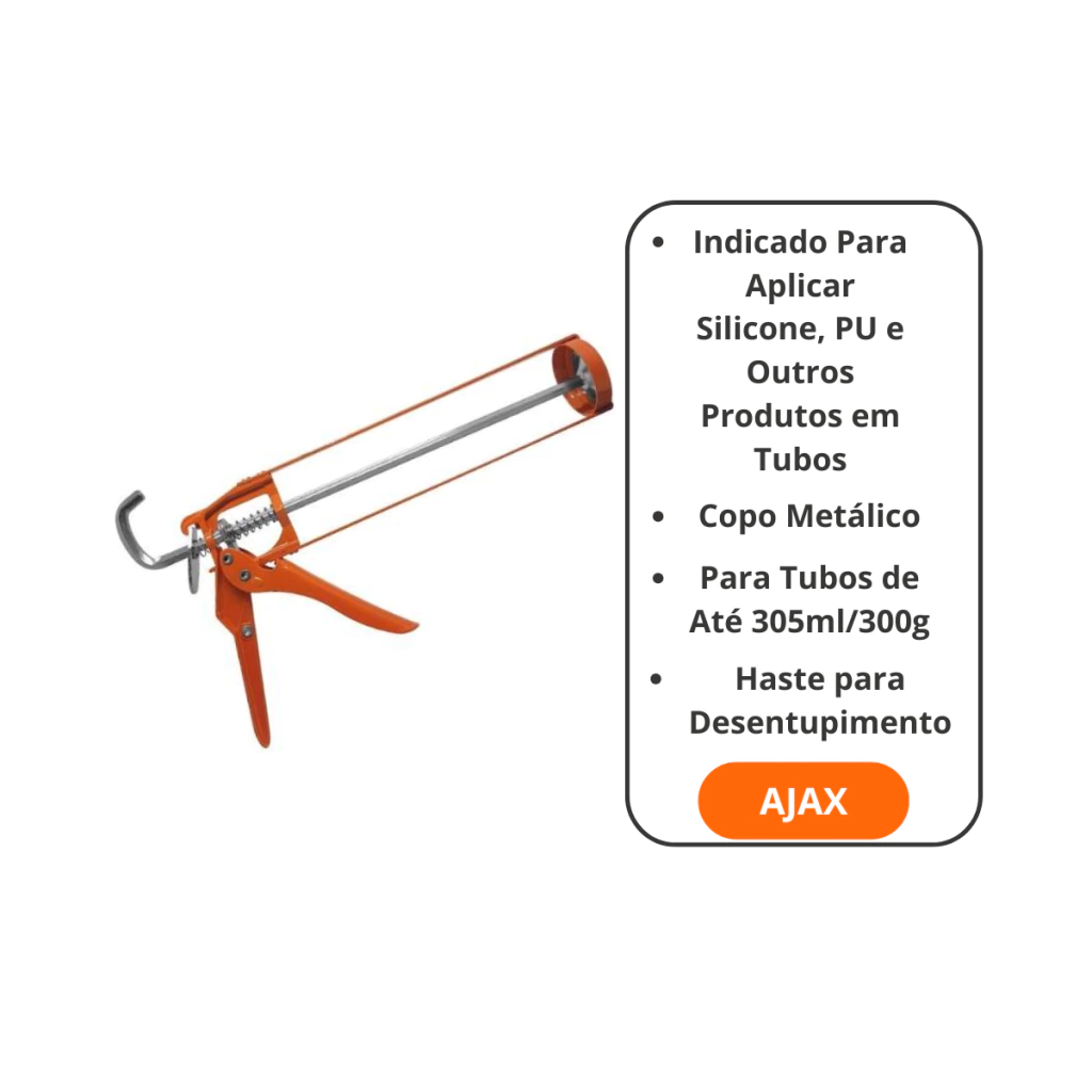 O Aplicador de Silicone 9” AJAX com 2 hastes é a ferramenta ideal para aplicação precisa e controlada de silicone, PU (poliuretano), selantes acrílicos e outros produtos similares em tubos de até 305 ml (ou 300g). Com copo metálico resistente, estrutura robusta e dupla haste de avanço, garante maior firmeza durante o uso e facilita a aplicação até em áreas de difícil acesso. Também conta com haste para desentupimento, ideal para destravar bicos de aplicação obstruídos.