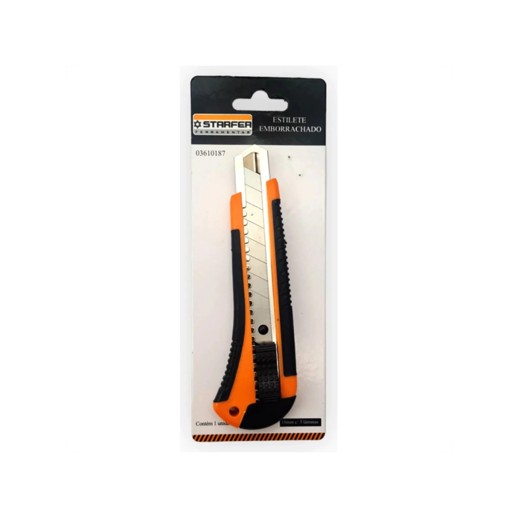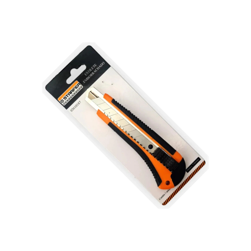 O Estilete 18mm da Starfer é uma ferramenta prática e segura para cortes precisos em diversos materiais. Possui corpo emborrachado que garante maior conforto e firmeza no manuseio, evitando deslizes durante o uso.