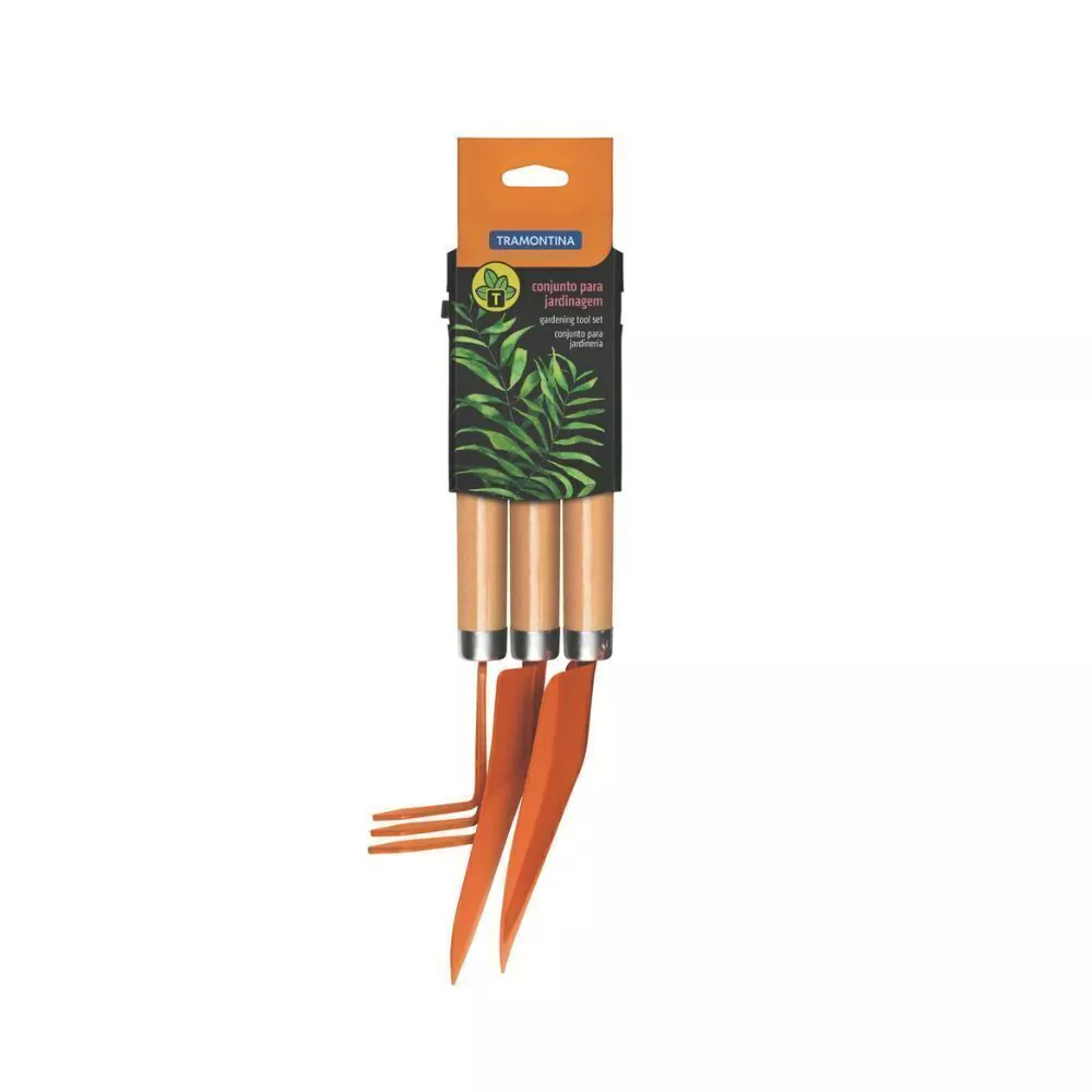 01 Pazinha Larga com cabo de madeira, 01 Pazinha Estreita com cabo de madeira, 01 Ancinho com 3 dentes e cabo de madeira.