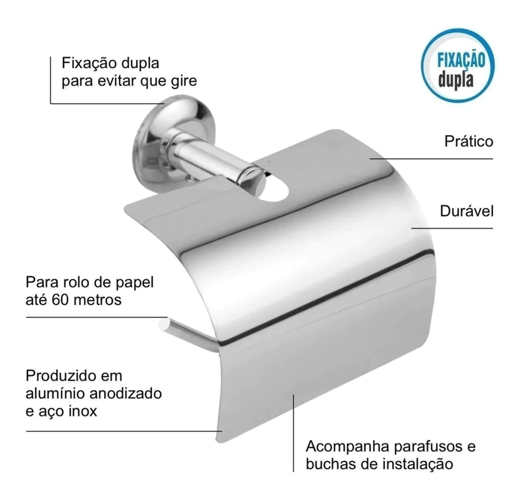 O Suporte Papeleira com Tampa em Aço Inox – Iguatemi é um acessório essencial para organizar e facilitar o uso do banheiro. Produzido em aço inox e alumínio anodizado, oferece resistência, durabilidade e acabamento cromado, garantindo que não enferruje com o tempo. Com fixação dupla, o suporte proporciona maior segurança e estabilidade na parede, acomodando rolos de até 60 metros. Seu design moderno e funcional combina praticidade e elegância, deixando seu banheiro sempre organizado.