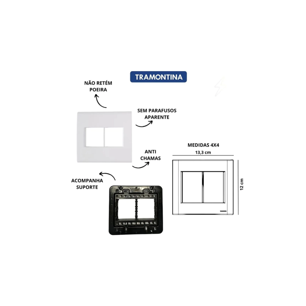 A Placa 4x4 4 Postos Liz Branca Tramontina é a escolha ideal para quem busca qualidade, durabilidade e acabamento sofisticado em instalações elétricas. Fabricada em termoplástico de alta resistência, possui acabamento brilhante que não retém poeira, garantindo fácil limpeza e estética moderna. Compatível com mecanismos das linhas Tramontina Liz, essa placa 4x4 com 4 postos proporciona versatilidade na montagem de interruptores e tomadas.