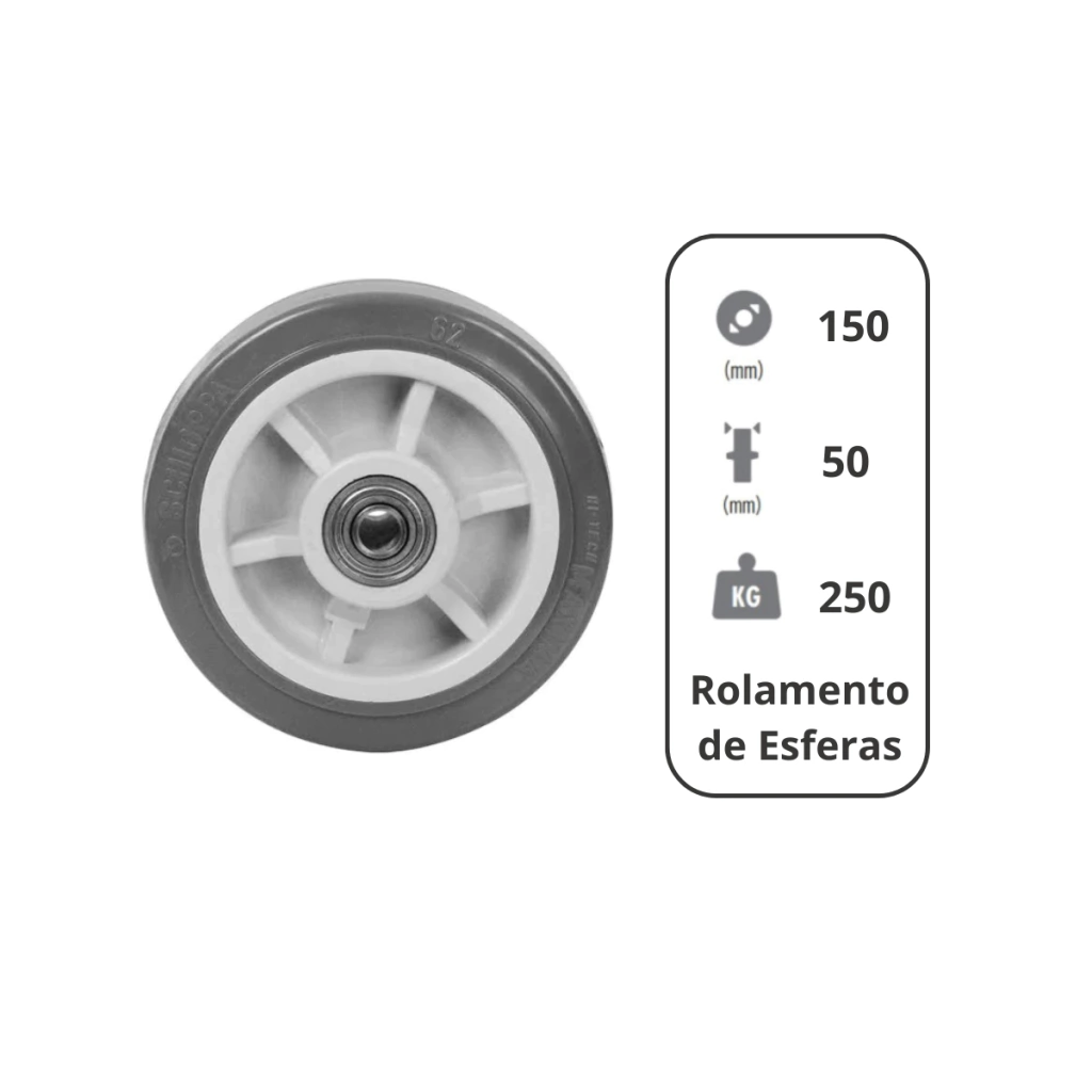 Com capacidade de carga de até 250 kg, apresenta rodagem macia e silenciosa, protegendo o piso e reduzindo ruídos em operações de movimentação. Possui dureza de 85 Shore A e resistência a temperaturas de -10°C a +50°C, sendo ideal para uso em diferentes condições de trabalho.