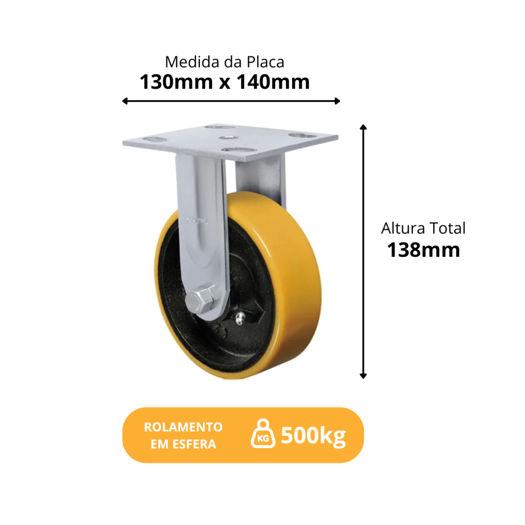 Sua estrutura metálica robusta — garfo em aço SAE 1010/1020 — e fixação por placa fixa suportam cargas elevadas, tornando-o adequado para uso em ambientes industriais, oficinas mecânicas, cozinhas industriais, indústrias químicas ou aplicações exigentes. A combinação de roda de poliuretano e mancais de esferas assegura rolamento suave e confiável.