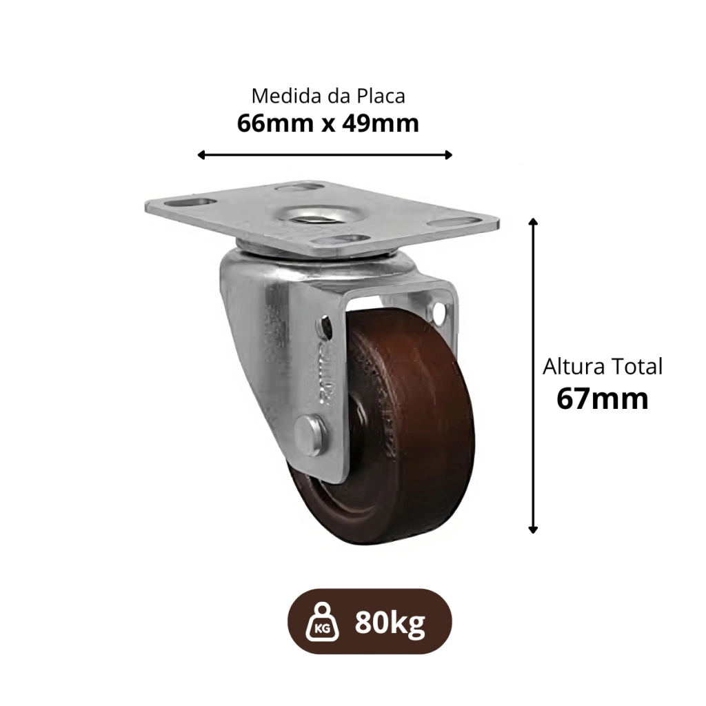 | Dimensões principais | Diâmetro da roda: 50 mm (2″); Largura da roda: 19 mm; Altura total: 67 mm |