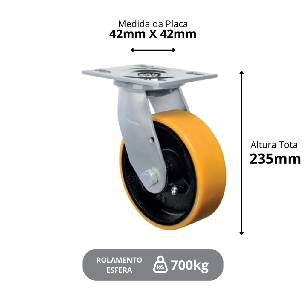 | Dimensões principais | Diâmetro da roda: 200 mm · Largura da roda: 50 mm · Altura total: 235 mm |