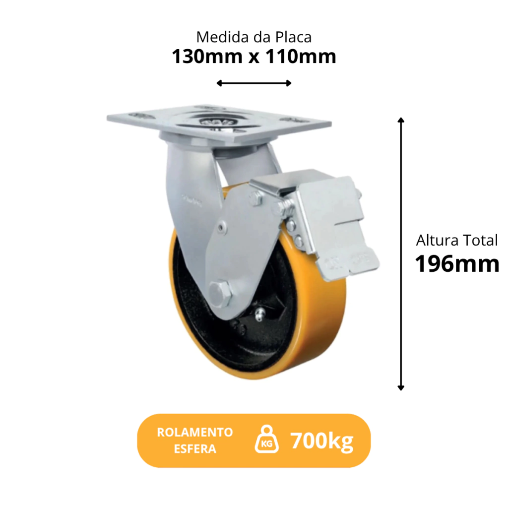 | Dimensões principais | Diâmetro da roda: 150 mm; Largura da roda: 50 mm; Altura total: 196 mm |