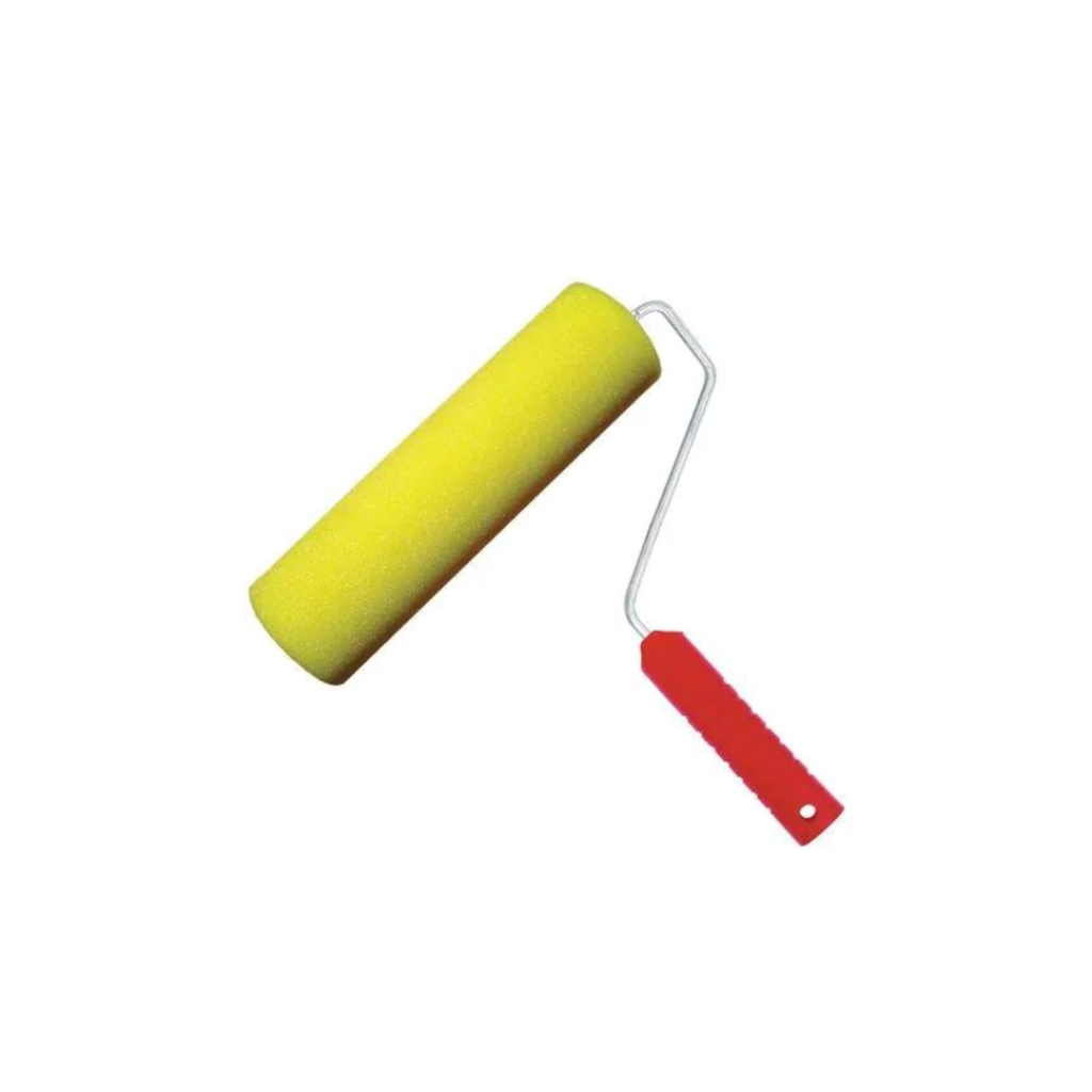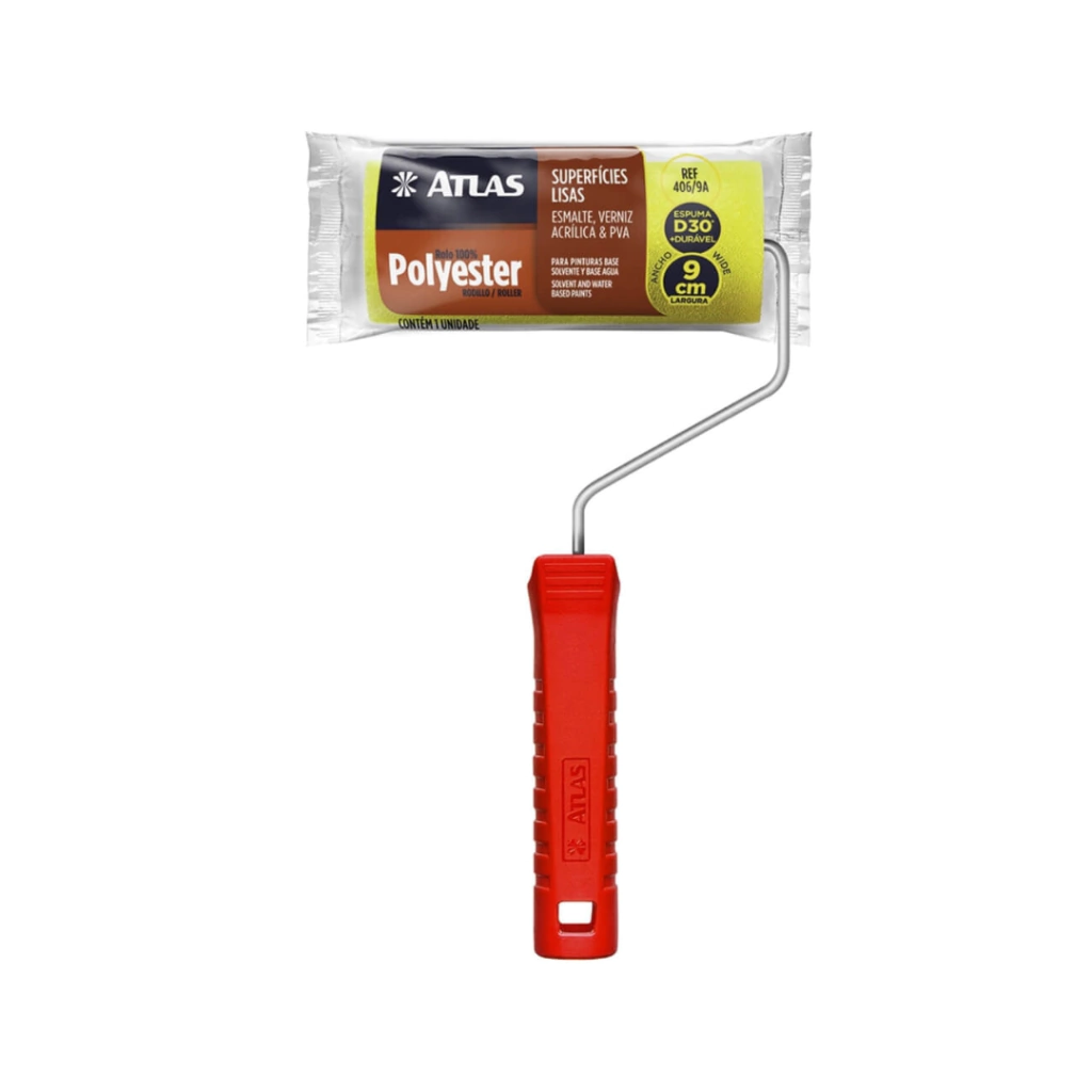 Rolo de pintura Atlas com espuma amarela de poliéster, indicado para superfícies lisas. Compatível com tintas esmalte, verniz e acrílica (PVA).